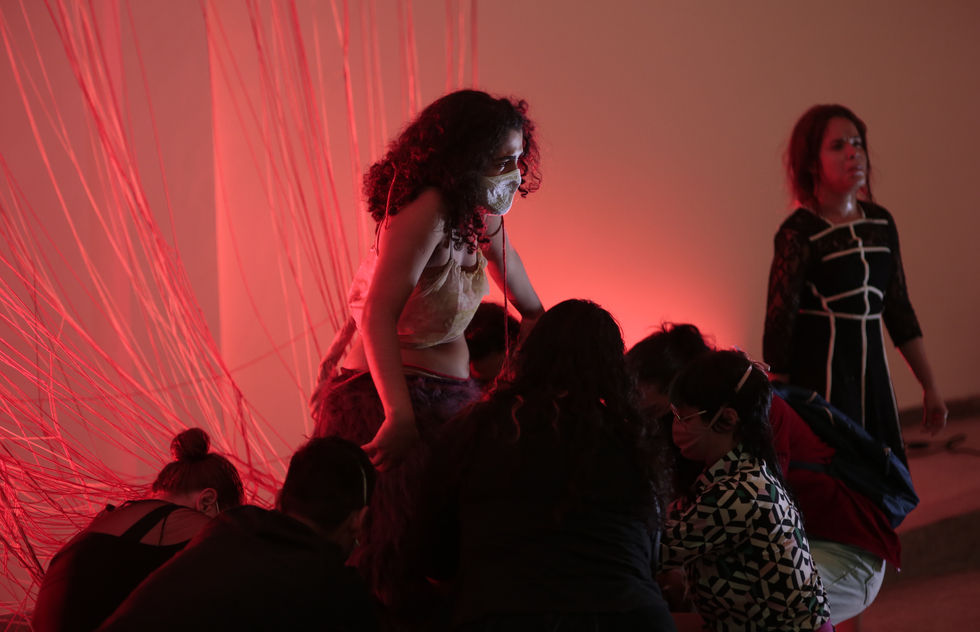 Uma avenida principal via universitária, estudantes ausentes, carros de passagem, estacionamentos vazios. Na esquina o teatro em reforma, talvez seja a nossa esperança de dias de fluxos que em tempos pandêmicos tornou-se carência. A entrada ao teatro reflete o abandono da plateia que é espelhada na sujeira e desordem do local, ora reflete uma sociedade em descaso, pautada em discursos hipotéticos sobre a sobrevivência de seus cidadãos e governada no caos da ignorância do patriotismo. Artistas são pertencentes da cena real, tiram os sapatos é adentram ao teatro em reforma, se dirigem até o palco, colocam-se nele de cabeça para baixo, na tentativa de levantar os personagens e receber aplausos da plateia ....